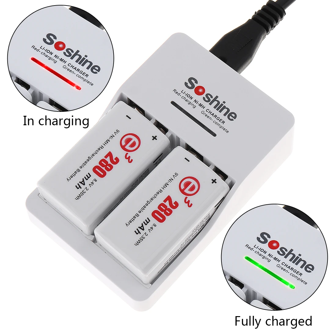 Vente Meilleur Soshine 2 pièces 9 V 6F22 280 mAh Ni MH batterie rechargeable + 9 V Intelligent Ni MH Li ion Chargeur avec indicateur led Pas Cher En Ligne.