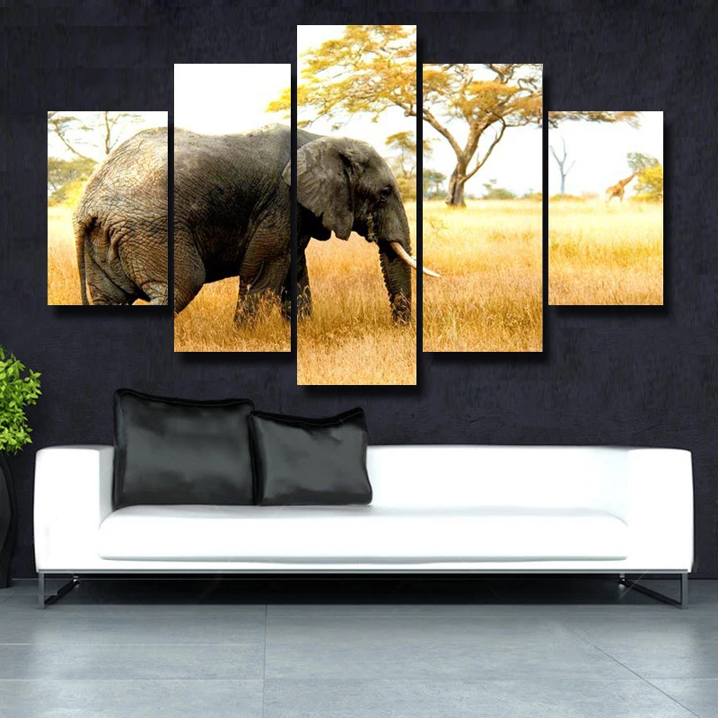 Acheter 5 Pièce Afrique Bébé Éléphant Animal Peinture Avec Jaune Arbre herbe Toile Art Print HD pour L étude Chambre Mur Encadrée peinture Pas Cher Prix
