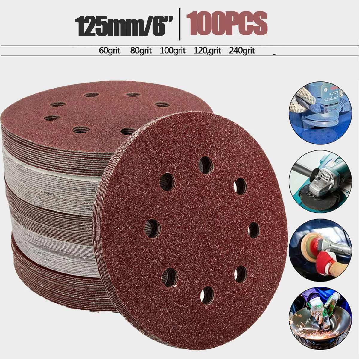 Acheter 100 pièces 125mm 5 Orbite Ponçage Feuille De Polissage Papier de Verre Forme Ronde Sander Disques Mixte 60 80 100 120 240 Grain Polonais Pad Pas Cher Prix