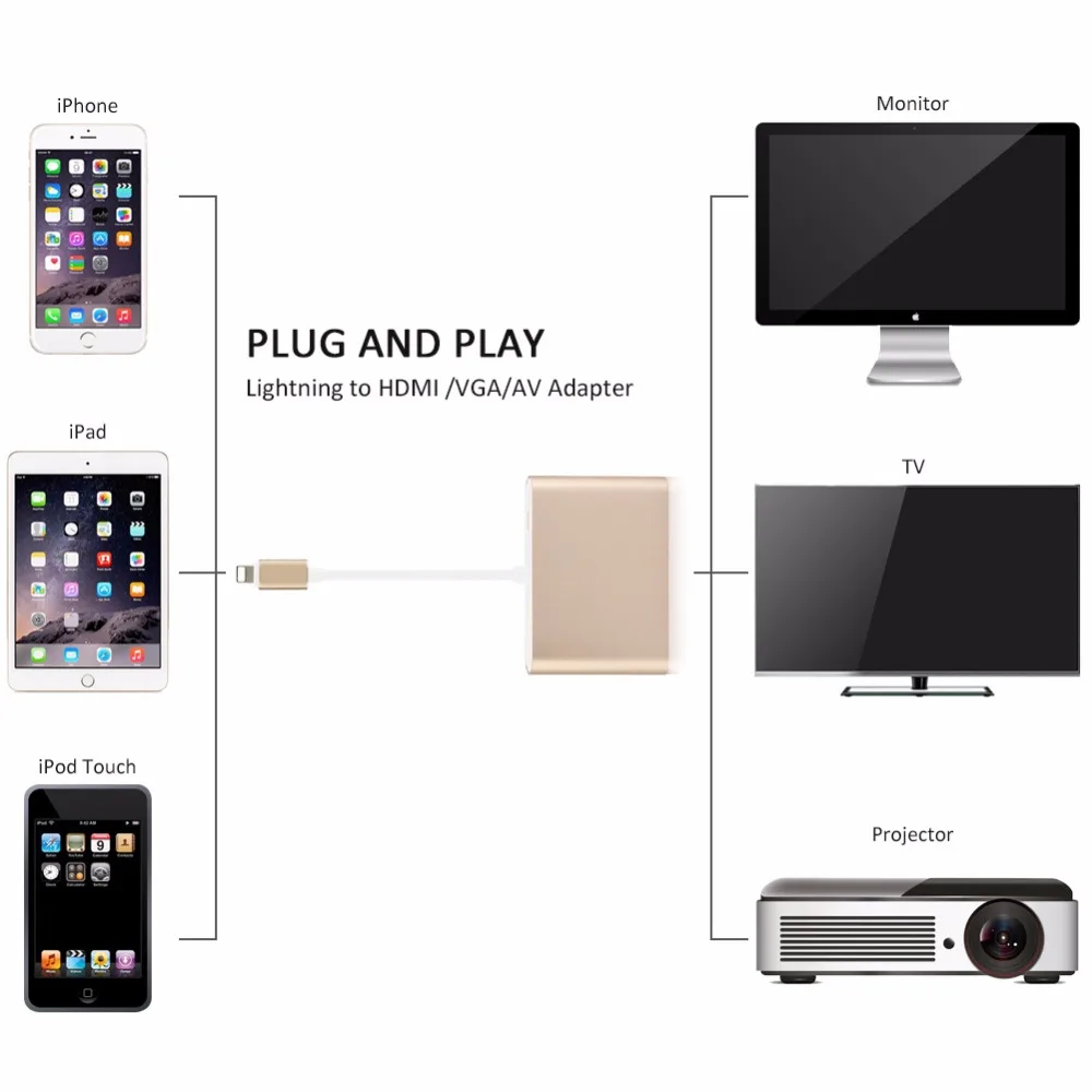 Achat Meilleur Haute Qualité Date Pour La Foudre à Numérique AV Vidéo HDMI HDTV VGA AV Câble Adaptateur Pour iPhone 8 7 7 Plus 6 6 s Pour iPad Série Pas Cher En Ligne.
